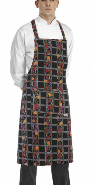 Szakácskötény chilipaprika mintával. Méret 70x90 cm. Elülső zseb. 100% pamut. Gyártó.