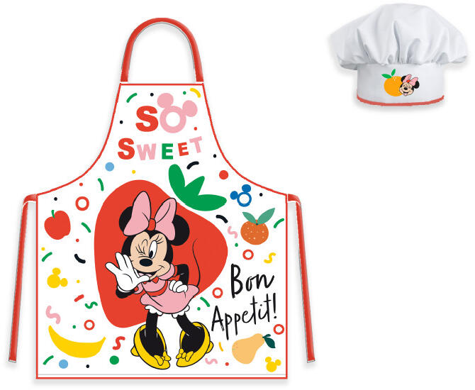 Disney Minnie Gyerek kötény szettAnyaga: 100% poliészterSzett tartalma:- 1 db kötény- 1 db kuktasapkaAjánlott 3-8 éves korig. Csomagolt termék, ajándéknak is kitűnő.