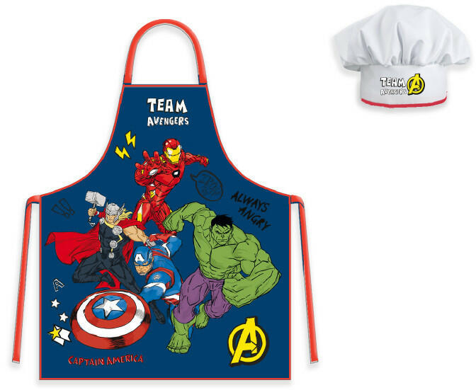 Avengers, Bosszúállók gyerek kötény szett Anyaga: 100% poliészter Szett tartalma: - 1 db kötény - 1 db kuktasapka Ajánlott 3-8 éves korig. Csomagolt termék, ajándéknak is kitűnő.