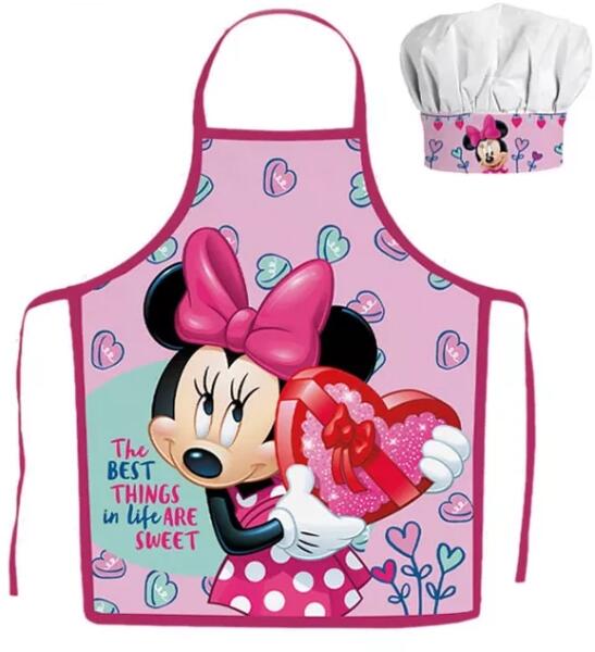 Disney Minnie gyerek kötény 2 darabos szett Anyaga: 100% poliészter Szett tartalma: - 1 db kötény - 1 db kuktasapka Ajánlott 3-8 éves korig.
