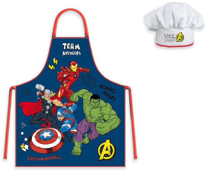 Avengers, Bosszúállók gyerek kötény szettAnyaga: 100% poliészterSzett tartalma:- 1 db kötény- 1 db kuktasapkaAjánlott 3-8 éves korig. Csomagolt termék, ajándéknak is kitűnő.