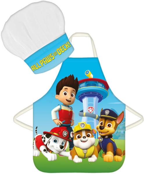 Paw Patrol, Mancs Őrjárat Gyerek kötény 2 darabos szett Anyaga: 100% poliészter Szett tartalma: - 1 db kötény - 1 db kuktasapka Ajánlott 3-8 éves korig. Csomagolt termék, ajándéknak is kitűnő.