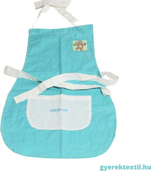 Gyerek kötény -menta pötty BRENDON névvel Utolsó darab! Csak ezzel a névvel kérhető! Kis kötény az apró segítőknek! KIVÁLÓ MAGYAR TERMÉK! Anyaga: pamutvászon Mérete: univerzális, pánttal állítható, kb. 10 éves korig jó!