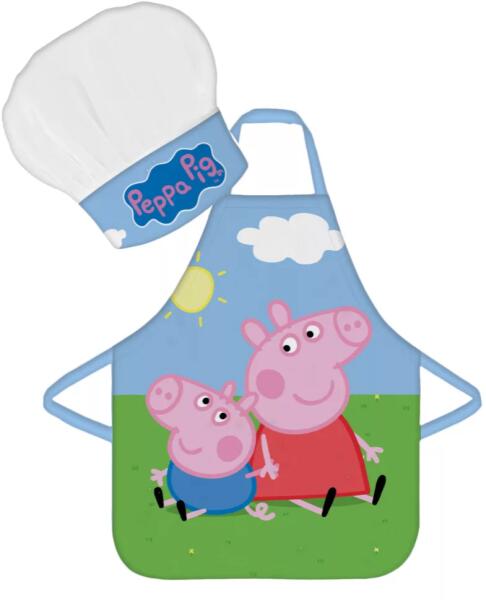 Peppa Pig, Peppa malac Field Gyerek kötény 2 darabos szett Anyaga: 100% poliészter Szett tartalma: - 1 db kötény - 1 db kuktasapka Ajánlott 3-8 éves korig. Csomagolt termék, ajándéknak is kitűnő.