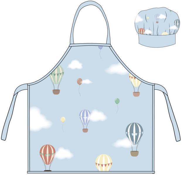 Air Balloon, Hőlégballon gyerek kötény 2 darabos szett Anyaga: 100% poliészter Szett tartalma: - 1 db kötény - 1 db kuktasapka Ajánlott 3-8 éves korig.