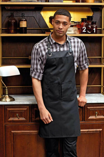 Uniszex, női, férfi kötény, szakács, pincér Premier PR123 Espresso' Bib Apron -Egy méret, Black/Brown Leírás: Fabric 65% Polyester. 35% Cotton Polyurethane trim Features Faux leather top trim and neckband Press stud buttons on the neckband for height adjustment Metal eyelets on the trim to facilitate neckband Two handy pleat pockets Pocket Measurement: 25 cm width. 16.5 cm depth Figyelem!