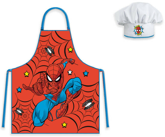 Spiderman, Pókember Gyerek kötény 2 darabos szett Anyaga: 100% poliészter Szett tartalma: - 1 db kötény - 1 db kuktasapka Ajánlott 3-8 éves korig. Csomagolt termék, ajándéknak is kitűnő.
