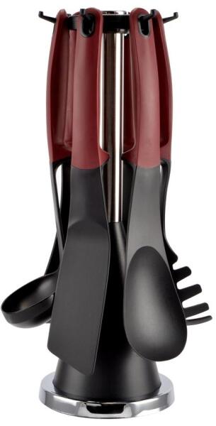 Anyaga: műanyag ; szilikon (TRP) Doboz mérete: 37,5*14*14 cm Bruttó súly: ~1,12 kg A szett tartalma: - 1 db állvány: 13 cm talp átmérő; 36,5 cm magas; 220 g - 1 db merőkanál: 9 cm széles fej; 29 cm hosszú; 120 g - 1 db lyukas kiszedőlapát: 9*12 cm fej; 31,5 cm hosszú; 120 g - 1 db kiszedőkanál: 7*10 cm fej; 31 cm hosszú; 120 g - 1 db spatula: 5*12,5 cm fej; 32 cm hosszú; 120 g