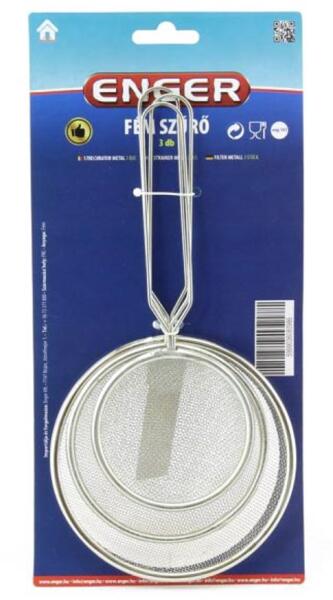 Enger fém szűrő 3db ENG-161 Hivatalos magyarországi forgalmazótól. Leírás: Sűrű szövésű szita, széles rozsdamentes acél peremmel. Hosszú fogantyú és széles tartókeret garantálja a biztonságos rögzítését bármilyen edényen.