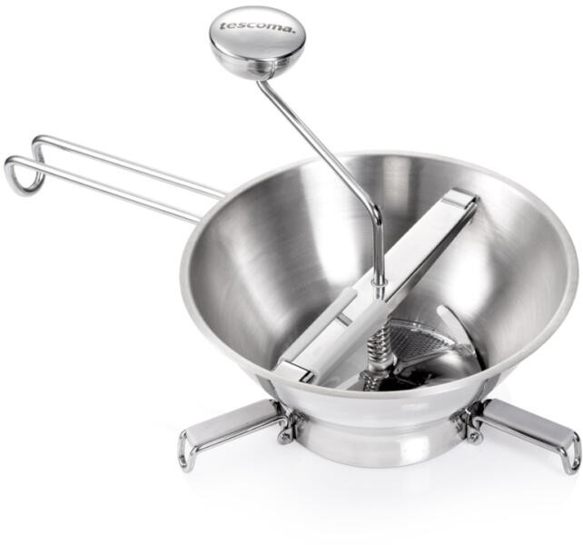 Tescoma GrandCHEF Passzírozó Zöldségek és gyümölcsök egyszerű és gyors passzírozására szolgál. Kitűnően alkalmas paradicsomsűrítmény, krumplipüré, zöldség- és gyümölcspüré készítésére. A szett tartozékai 3 passzírozó tárcsa, egy passzírozó lapát, mely hasznos nagy mennyiségű gyümölcs vagy zöldség akadálymentes passzírozása esetén. Anyaga első oszt