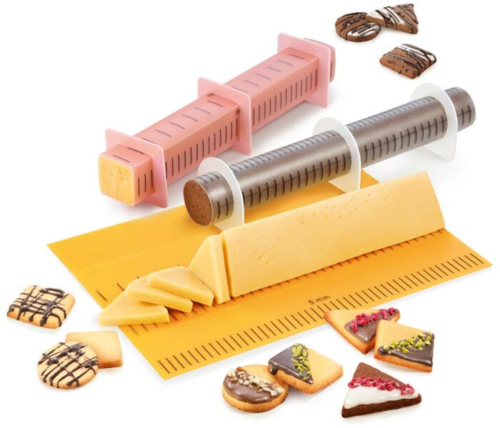 Kiválóan alkalmas édes és sós, sült és sütés nélküli sütemények, kekszek, mézeskalácsok és száraz tésztából készült kekszek egyszerű és gyors elkészítéséhez, alkalmas sushi készítésére is. Három rugalmas sablon süteményekhez négyzetek, háromszögek, kis és nagy körök alakjában. Skálával a pontos szeleteléshez, és karikákkal a tészta hűtőszekrényben