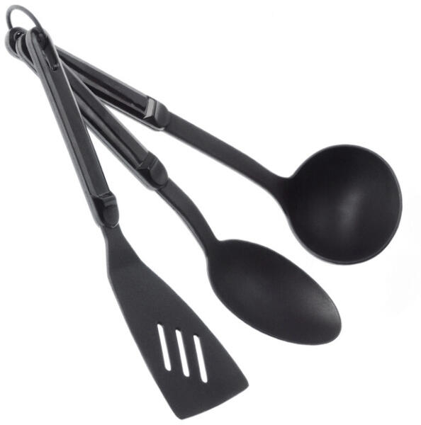 Magas hőmérsékletnek ellenálló konyhai szerszámkészlet, praktikus minden szakács számára. A fogantyúk végén lyukak találhatók a könnyű felakasztás érdekében. Tulajdonságok: Tartós és könnyen mosható anyagAlakított fogantyúParaméterek: Garancia: 2 évSúly: 113gMéret: 300x84x91mmMaterial: Nylon