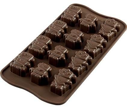 Szilikonforma tizenkét csokoládéhoz, három különböző típusú aranyos robot alakjában.