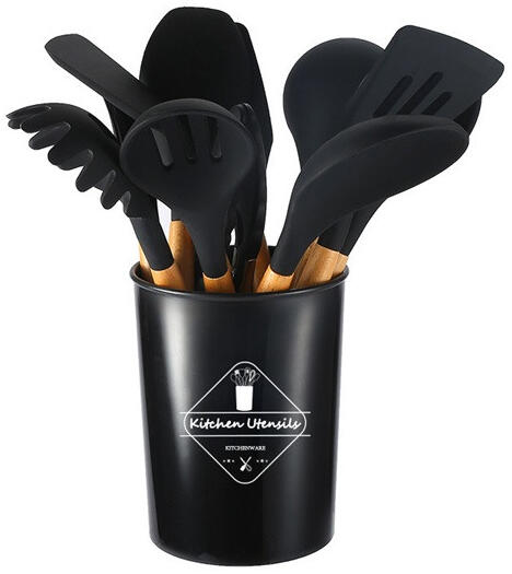 Iris KT-007-BK 12 db-os fekete konyhai eszköz készlet 12 darabos silicon konyhai eszközkészlet műanyag tartóval Hőálló kivitel Könnyen tisztán tartható Szín: fekete