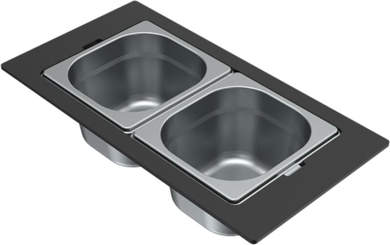 ELLECI gourmet kit 2 részes aluminíum tároló edény inox színben, fekete HPL kerettel. Méret: 418x220x100 mm. Használható ELLECI ZEN, ZEN-F 130, 105, 102 mosogatókhoz.