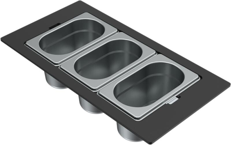 ELLECI gourmet kit 3 részes aluminíum tároló edény inox színben, fekete HPL kerettel. Méret: 418x220x100 mm. Használható ELLECI ZEN, ZEN-F 130, 105, 102 mosogatókhoz.