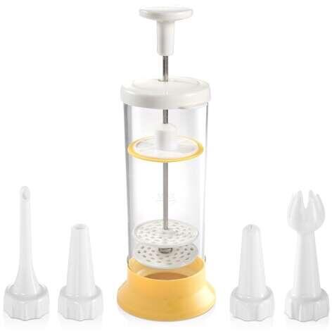 DELÍCIA Habverő és díszítő csőKiválóan alkalmas a házi tejszínhab könnyű és gyors elkészítésére, majd egyenesen ebből a habverőből díszíthetjük ételeinket vagy italainkat, nincs szükség a tejszínhab külön habzsákba töltésére. A szilikon tömítésnek köszönhetően a tejszín a habosítás során sem jut ki az eszközből. A csomag 3 díszítő- és 1 töltőfeje