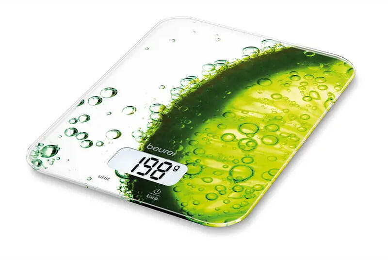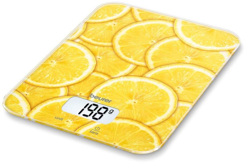 Beurer KS 19 (20 x 14,5 x 1,7 cm) Lemon konyhai mérleg Modern szenzorgombos kezelés Könnyen tisztítható üvegfelület Teherbírás: 5 kg Beosztás: 1 g Átállítás g, ml, oz, fl. oz, lb:oz között Tára hozzámérési funkció Kikapcsoló automatika, túlterhelés kijelzése Méret: 20 x 14,5 x 1,7 cm Kijelző mérete: 4,6 x 2,4 cm Számjegyek mérete: 20 mm 1 x 3 V CR2032 elemmel