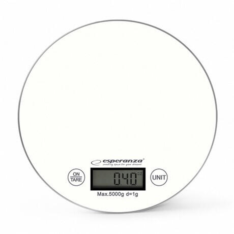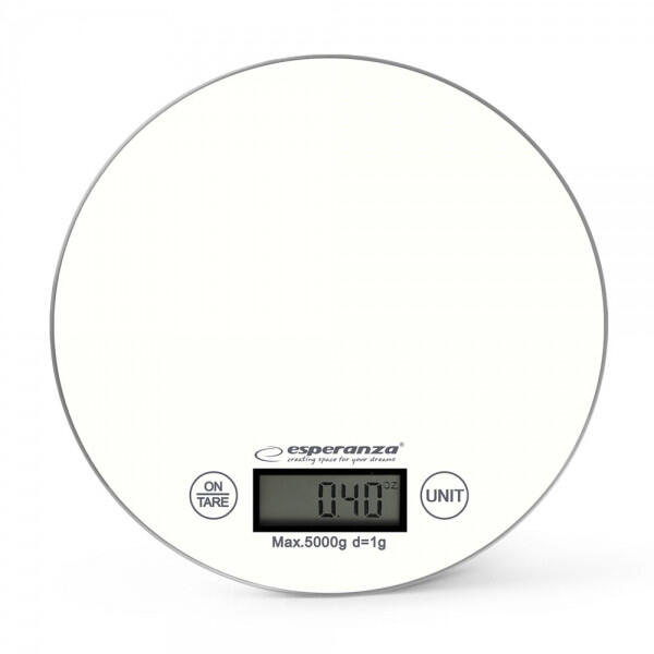 Elektronikus konyhai mérleg, 5 kg, 1 g, Fehér, Pultonálló, Kör Esperanza EKS003W. Típus: Elektronikus konyhai mérleg, Maximális súlykapacitás: 5 kg, Pontosság: 1 g. Kijelző típusa: LCD. Akkumulátor típus: CR2032, Akkumulátor-technológia: Lítium. Szélesség: 200 mm, Mélység: 200 mm, Magasság: 30 mm. Mennyiség csomagonként: 1 dB, Mellékelt elemek száma: 1 dB