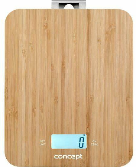 A Concept VK5714 Bamboo digitális konyhai mérleg 15 kg terhelhetőséget kínál 1 g pontossággal. LCD-kijelzővel rendelkezik, ébresztőóra és percmérő funkcióval, továbbá praktikus TARE lehetőséggel is. A mérleg sima felülete nagyon tartós és könnyen tisztítható. 4 egység közül választhat - g/kg/oz/lb. Egy Concept mérleget biztosan nem rejt majd el a szekrényben