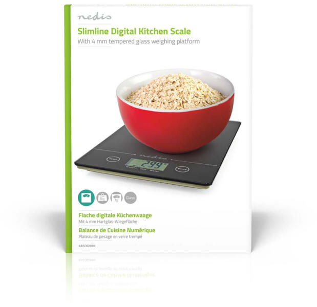 Digitális fekete színű konyhai mérleg - Nedis Ez a modern, vékony és felhasználóbarát konyhai mérleg 4 mm vastag edzett üvegből készült mérlegfelülettel rendelkezik. A nagy és tiszta LCD-kijelző könnyen leolvasható, és a praktikus tárázó funkciónak köszönhetően ebben a mérlegben minden megvan, amire Önnek a mindennapi használathoz szüksége lehet. A digitális érin