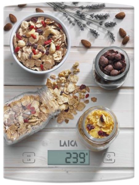 Laica digitális konyhai mérleg , mutatós müzlis dizájnnal. Mérési tartomány max 5 kg; Nagyobb mérési felület: 20,5 x 14,6 x 1,8 cm LCD KIJELZŐ LCD 5 x 2 cm Érintő gombos kezelés Felület anyaga: edzett üveg Mérési pontosság: 1 g 1 db 3V CR2032 elemmel működik (tartozék)