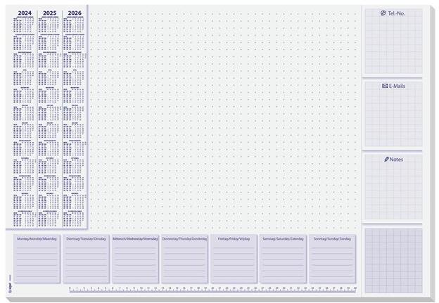 Kiváló minőségű, 80 g / m2-es papírból készült íróasztal könyöklő merev hátlappal. - 3 éves naptárral - heti tervezővel - háromnyelvű: angol, német és holland - 30 lap Kiszerelés: 1 db/db