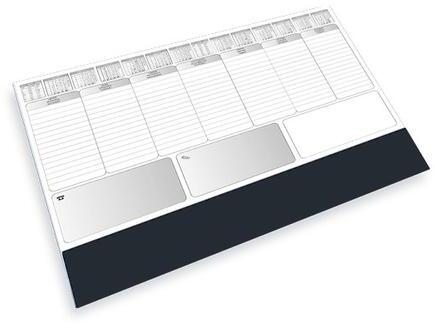 Ragasztott asztali naptártömb, színes műbőrcsíkkal, kétéves összefoglaló naptár a visszahajló fül belső felén található. 26 lap, ragasztott, 90g-os fehár papírral. Egyediesítés: présfólia, vakdombor, szita. Méret: 570x390 mm