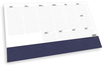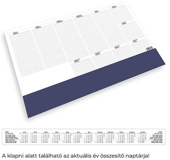 Szitázással, présfólia- és vaknyomással emblémázható, műbőr szamárfül védővel ellátott könyökalátét. -26 letéphető lapot tartalmaz -a klapni alatt található az aktuális év összesítő naptárja -beosztás: heti -mérete: 576 × 407 mm