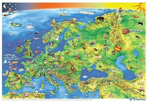 Részletes Európa térkép, melyen az Uniós ismeretek is megtalálhatóak. A gyerektérkép bohókás piktogramjai játékosan segítik átadni az ismereteket.