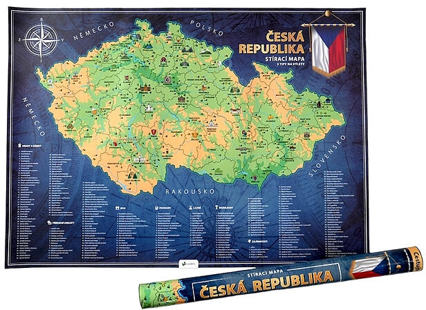 Csehország lekaparható térképe, mely abból a szempontból kivételes, hogy a már meglátogatott helyeket lekaparással jelölheti meg. A kaparós sorsjegyekhez hasonlóan használható. Méretei: 82 x 59 cm.