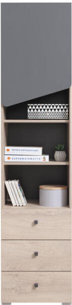 Nyitott polc 3 polccal és kihúzható fiókkal. Méret: 60x180x35- A polc kopásálló laminált lapból készült - A polcok saját konfiguráció szerint szerelhetők, 3 szerelőlyuk van a polc magasságában - A fiók fém görgős síneken mozog, kihúzás elleni retesszel - Az élek ABS élzáróval vannak borítva, amely magas védelmet nyújt a sérülések ellen - Önállóan összeszerel