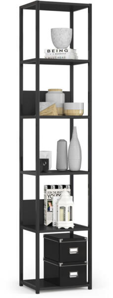 Modern, keskeny loft stílusú állvány 6 polccal, amely tökéletes megoldást nyújt a tárolásra és dekorációra. A fekete fém váz és a laminált polcok elegáns megjelenést kölcsönöznek ennek a sokoldalú bútordarabnak. Stílusos tárolás modern környezetbenEz a karcsú, 40 cm széles loft polcos állvány tökéletesen ötvözi a funkcionalitást és a modern dizájnt. A fekete