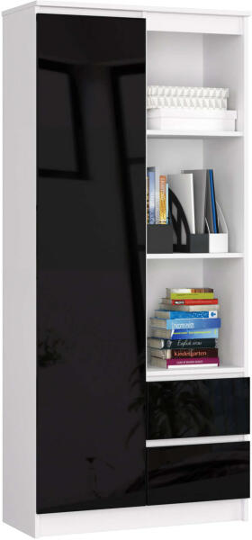 Irodai szekrény ajtókkal és fiókokkal fehér színben, fekete fényes frontokkal. - A szekrény 16 mm-es kronospan kopásálló laminált lapból készült - A szekrénynek összesen 6 polca van - A fiókok görgős fémcsúszkákon mozognak, kihúzásgátlóval - Az élek ABS élzáróval vannak borítva, amely magas védelmet nyújt a sérülések ellen - A szekrényt csomagokban szállítju