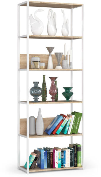 Modern, loft stílusú állvány 6 polccal, amely tökéletes választás otthoni vagy irodai tároláshoz. A fehér fémváz és sonoma tölgy polcok elegáns kombinációja praktikus tárolási megoldást kínál könyvek, dekorációs tárgyak és egyéb kellékek számára. Stílusos tárolás modern kivitelbenEz a loft stílusú polcos állvány tökéletesen ötvözi a funkcionalitást és a