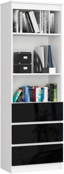 Modern és praktikus irodai könyvespolc három fiókkal és két nyitott polccal, amely tökéletes egyensúlyt teremt a tárolás és a megjelenítés között. A fehér korpusz és a magasfényű fekete fiókok elegáns kontrasztot alkotnak. Elegáns tárolási megoldás modern irodákbaEz a 180 cm magas könyvespolc tökéletesen ötvözi a funkcionalitást és a stílust. A fehér korpusz és