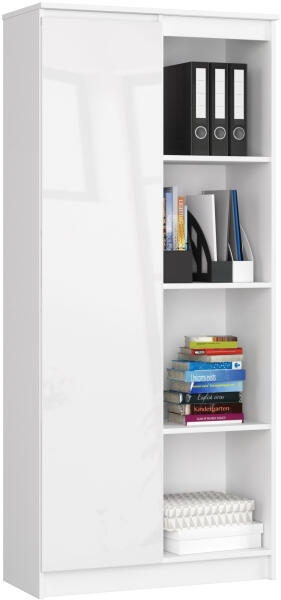 Modern, skandináv stílusú irodai szekrény 8 polccal és magasfényű ajtóval. Tökéletes választás dokumentumok és irodai kellékek rendszerezett tárolásához, fehér színben. Elegáns tárolási megoldás modern irodai környezetbeEz a 180 cm magas irodai szekrény tökéletes egyensúlyt teremt a funkcionalitás és az esztétika között. A fehér magasfényű MDF ajtó és a prakti