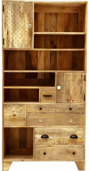 Indiai mangóból készült masszív tömörfa könyvespolc. A mangófa kivételes tartósságáról és egyedi megjelenéséről ismert. Praktikus fiókok és ajtók különböző típusú fogantyúkkal, kézzel faragott díszekkel díszítve. Minden egyes bútordarab eredeti, és természetes és egzotikus jelleget kölcsönöz a belső térnek. Ökológiai választás, egyedi megjelenés. Tart