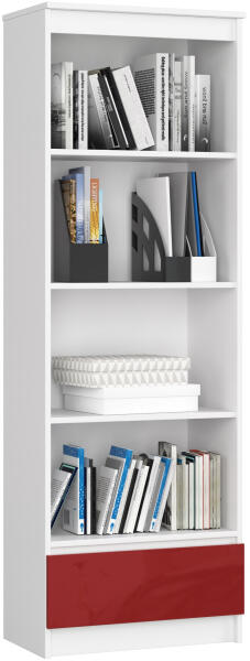 Modern, 180 cm magas könyvespolc egy fiókkal és négy polccal, fehér laminált korpusszal és magasfényű piros fiókfronttal. Ideális megoldás könyvek, dokumentumok és dekorációs tárgyak tárolására otthoni vagy irodai környezetben. Elegáns tárolási megoldás modern otthonokbaEz a 180 cm magas könyvespolc tökéletes kombinációja a funkcionalitásnak és a modern designnak. A