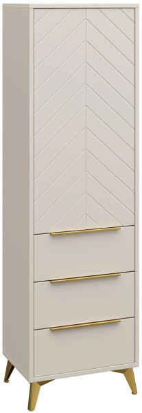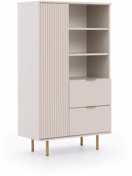 Elegáns NUBIA NB-04 polcos szekrény bézs színben, amely igazán jó választás lehet a nappaliba vagy a dolgozószobába is. A szekrény luxusos és nem mindennapi designnal rendelkezik. Az arany színű magas fém lábak és a fogantyúk teszik fel az i-re a pontot. A három nyitott polcnak köszönhetően a szekrény könyvespolcként is használhatja. Ezen kívül a polcos szekrény rendel