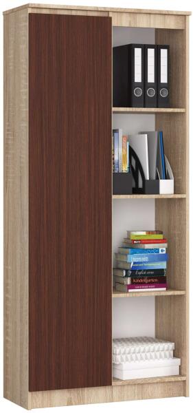 Irodai könyvespolc CLP 80cm 1 ajtó 8 polccal Szín Sonoma Wenge frontok Kopásálló, 16 mm-es laminált lapból készült. Szélei ABS szegéllyel borítottak. Méretek: Hosszúság - 80cm Magasság - 180cm Mélység - 35cm- Polcegység a Kronospan által gyártott 16mm-es laminált lapból készült, kopásálló. - A polc összesen 8 polccal rendelkezik - Ajtó szerelés mindkét oldalon - sz