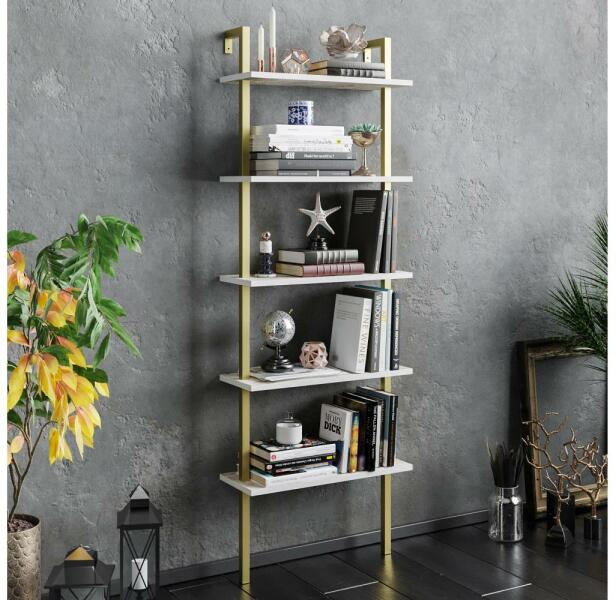 Tágas könyvespolc modern dizájnnal. Egyszerű, modern stílusa miatt bármilyen otthonba illik. Alkalmas könyvek tárolására, de dekorációk, virágok és még sok minden más tárolására is. Fehér és arany színben kapható. A polcok laminált forgácslapból, a lábak fémből készültek. Anyagvastagság: 1,8 cm. A polcok száma: 5. A polcok magassága: 30 cm. Maximum terhelhetőség