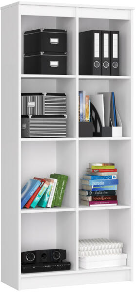 Modern, nyolcpolcos fehér irodai könyvespolc, amely tökéletes megoldást nyújt könyvek, mappák és irodai kellékek rendszerezett tárolására. A 16 mm-es laminált lapból készült, ABS élzárással ellátott bútor egyesíti a funkcionalitást és az elegáns megjelenést. Professzionális tárolási megoldás az irodába és otthonraEz a modern, fehér irodai könyvespolc tökéletes