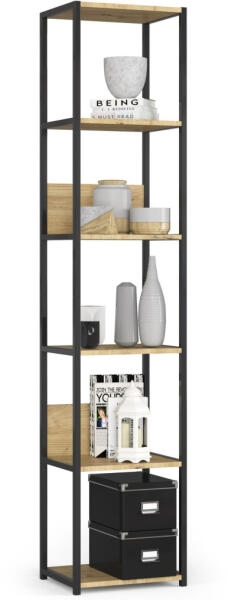 Modern ipari stílusú polcos szekrény 6 polccal, amely tökéletesen ötvözi a fekete fémvázat és az artisan tölgy polcokat. Ideális választás mind otthoni, mind irodai környezetbe, ahol stílusos tárolóhelyre van szükség. Elegáns és praktikus tárolási megoldás modern környezetbeEz a karcsú, 40 cm széles ipari polcos szekrény tökéletes választás a modern otthonokba és
