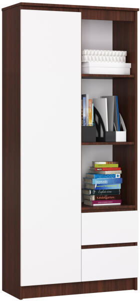 Modern irodai könyvespolc wenge és fehér színkombinációban, 2 fiókkal és egy ajtóval. Ideális megoldás dokumentumok és könyvek rendszerezett tárolására, kiváló minőségű laminált lapból készült. Elegáns és praktikus tárolási megoldás az irodábaEz a modern könyvespolc tökéletes egyensúlyt teremt a funkcionalitás és az esztétika között. A wenge és fehér szín