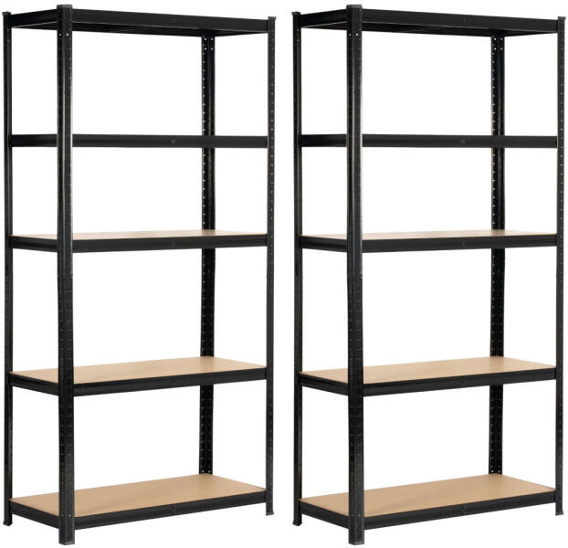 Erős, fekete fém polcrendszer 5 MDF polccal, ideális garázsokba és tárolóhelyiségekbe. 175 kg-os polconkénti teherbírással és stabil acél szerkezettel rendelkezik, amely maximális tárolási megoldást biztosít. Professzionális tárolási megoldás nagy teherbírássalEz a robusztus fém polcrendszer tökéletes választás garázsok, műhelyek és tárolóhelyiségek számára. A