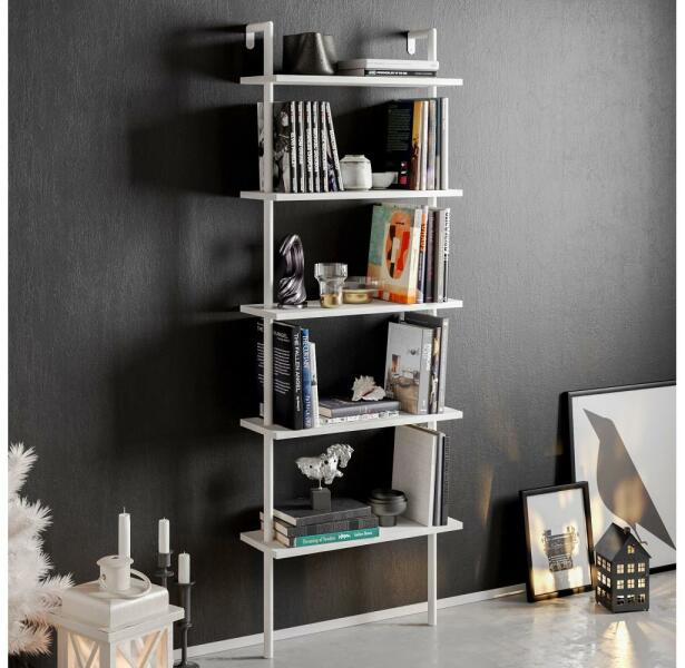Könyespolc 5 polccal. Egyszerű, modern stílusának köszönhetően bármelyik otthonba illeszkedik. Laminált forgácslapból és fémből készült. Polcok mérete: 30 x 51 x 22 cm. Az anyagvastagság: 1,8 cm. Falra szerelhető. Maximum terhelhetőség: 15 kg.