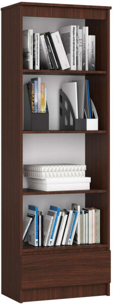 CLP 60 cm-es POLC 1 FIÓKKAL 4 POLCCALWenge szín 16 mm-es kopásálló laminált lapból készült. ABS élzárással Méretek: Hosszúság - 60 cm Magasság - 180 cm Mélység - 35 cmA CLP 1 modellű polc látványos wenge színben készült. A sötét csokoládé mély árnyalata kiválóan harmonizál más berendezési elemekkel, amelyek kiegészítésként vagy kontrasztként választhatók.