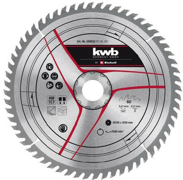 Einhell Körfűrészlap 250x30x3,2mm 60 fogas (49589552) Keményfém lapkás körfűrészlap asztali körfűrészekhez és gérvágó fűrészekhez. Méretek:Külső átmérő: 250.0 mmFurat: 30 mmMax. fordulatszám: 7600 ford. /percTörzslap vastagság : 3,2 mmFogszám: 60 dbAlkalmas: tömör fa, puhafa, laminált fa, pvc vágásáhozKompatibilis készülékek: TC-TS 1200; TE-SM 36/210, TE-SM 213