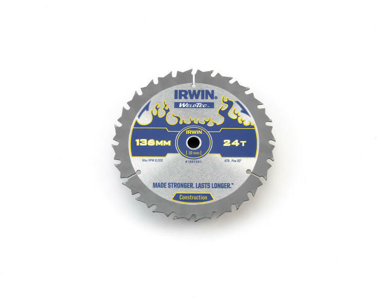 IRWIN körfűrészlap kézi akkumulátoros körfűrészhez 136/10mm 24ATB HEGESZTETT KARBID KEMÉNYFÉMBŐL KÉSZÜLT FOGAK 30%-kal erősebb kötést biztosítanak a fűrészlaptesttel és 50%-kal hosszabb élettartamot eredményeznek ULTRAKOMAPKT KARBID ANYAG 70%-kal keményebb mint standard változata, amely kíváló minőségű éles vágást eredményez INNOVATÍV FURATOKKAL A HŐELVEZETÉSRE